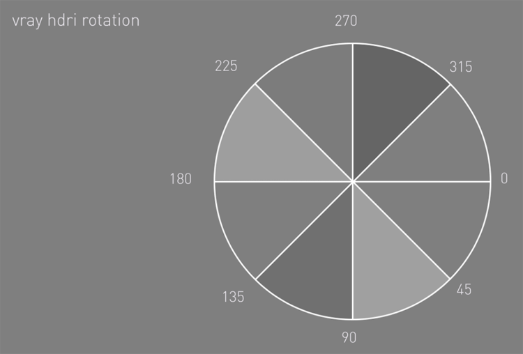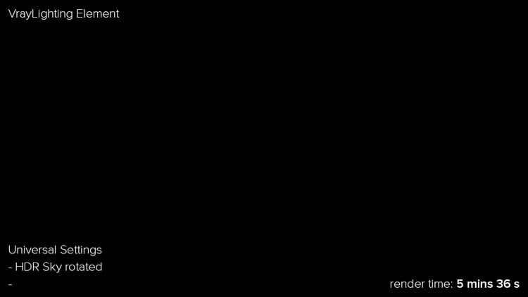 Сцена, которую я посылал имела копию низкого разрешения HDR неба в vraydomelight, а полноразмерную версию в слоте environment в настройках vray. Возможно это немного старомодный способ, чтобы попытаться добиться более быстрого времени рендеринга, но как показано выше, он может быть не намного быстрее и он теряет много чёткости в тенях.