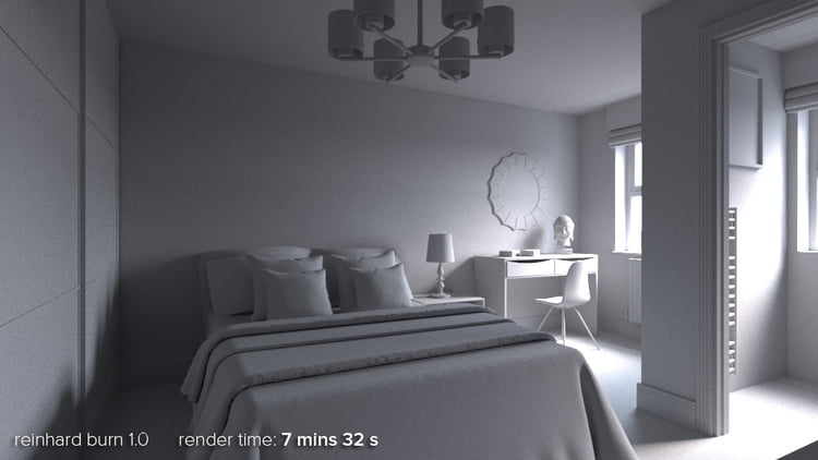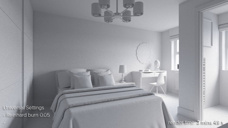 Самое крутое в цветовой проекции vray это то что, даже если вы рендерите в 32-х битный exr (или 16-битное изображение) и не хотите пересветить гамму, вы всё равно можете продолжать использовать reinhard burn, чтобы ускорить процесс рендеринга. В данном примере медленный рендер настроен с линейным рабочим пространством (фактически reinhard burn 1.0, что есть одно и тоже), а быстрый с reinhard burn 0.05, но в режиме переключенном на «NONE» (ничего не применено). Это означает, что vray внутренне использует burn 0.05 для адаптации, но не теряет значение rgb в вашем изображении. В примере ниже, быстрый рендер со значительно большим шумом, но различие в скорости колоссальны, поэтому вы просто можете понизить шум и при этом выиграть в скорости.