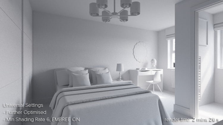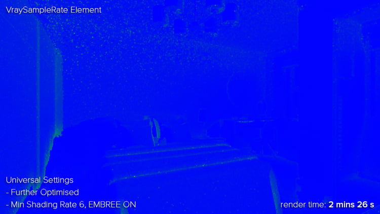 Прежде всего, я установил Min Shading Rate на 6, что дало существенную разницу. Смотрите пост в блоге Универсальные настройки VRay 3.0. Далее я включил EMBREE, так как мой процессор поддерживал его, для дополнительного понижения времени рендеринга.