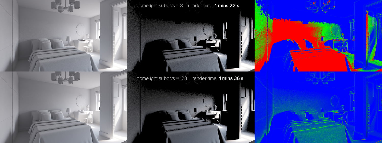 HDR Domelight subdivs: в прошлом у меня был неудачный опыт с изменением сабдивов domelight, но для brute force в этой сцене это не имело ни какого значения. Я предполагаю, что это из-за того, что Min Shading Rate сам по себе уже максимально оптимизирован.